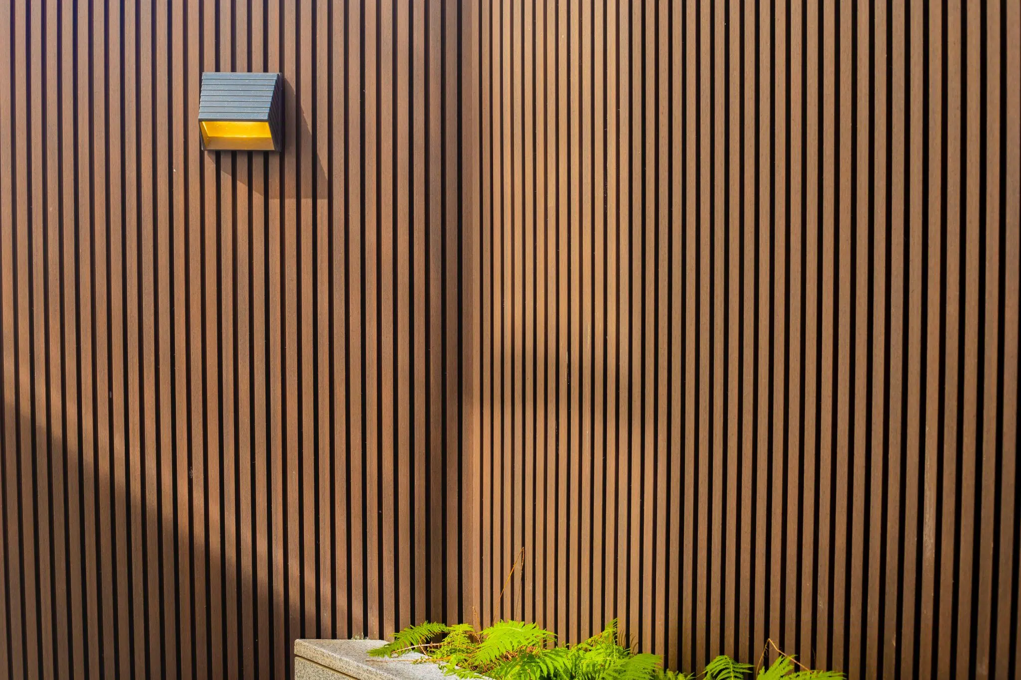 ใช้ไม้ระแนง WPC (Wood Plastic Composite) หรือ ASA-Coextrusion ที่มีความทนทานสูง ไม่ซีด ไม่บวมน้ำ และไม่ต้องทาสีซ้ำ