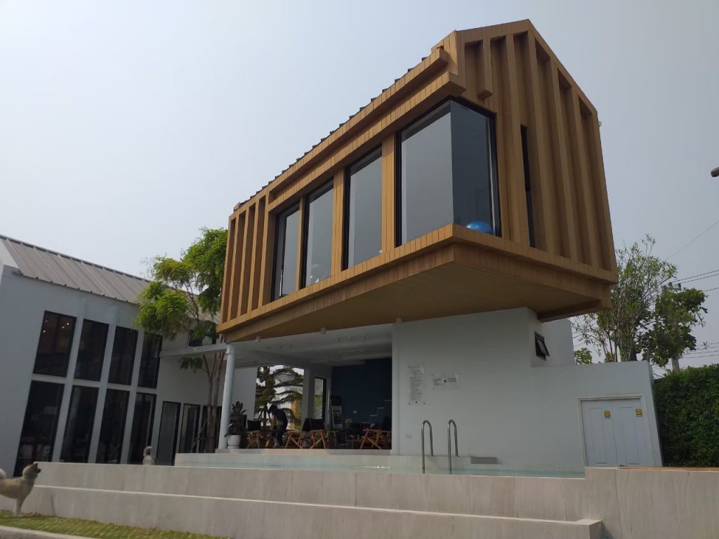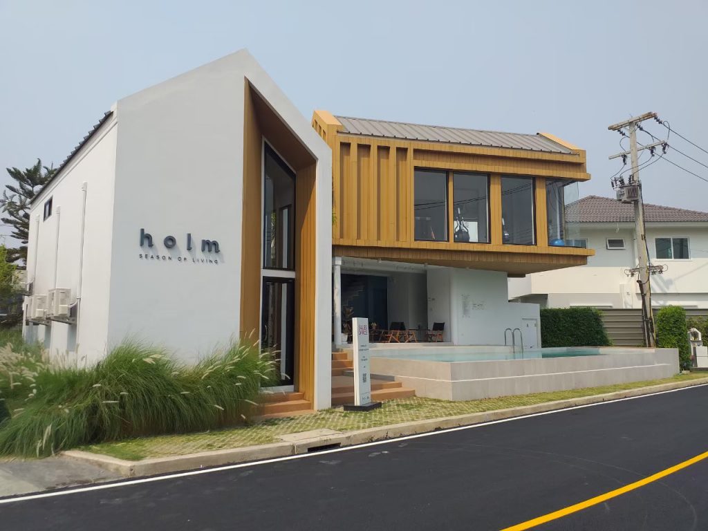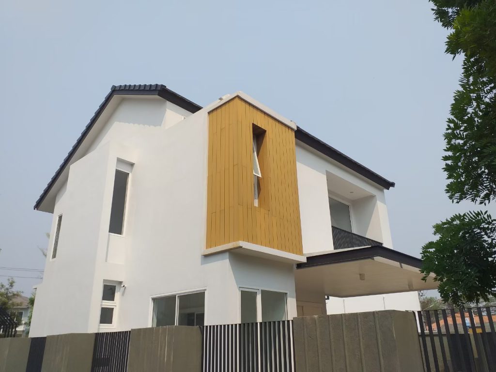 ภาพหน้างาน จาก Holm จังหวัดเชียงใหม่ ตกแต่งที่ให้ความสวยงาม ลูกค้าเลือกใช้ OWC-001-TK ไม้กรุผนังภายนอก มีน้ำหนักที่เบา มีความแข็งแรง เหนียวไม่เปราะหรือแตกหักได้ง่าย ทนแดด ทนฝน ไม่ต้องทาสีในครั้งแรกและครั้งต่อไป